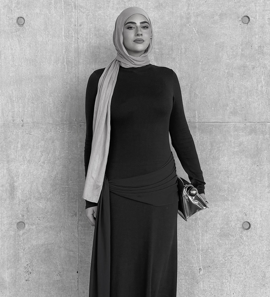 Zelda Asymmetric Slinky Midi Dress - Black