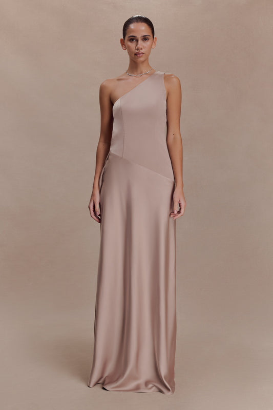Lyla Asymmetrical Satin Maxi Dress - Bronze Taupe