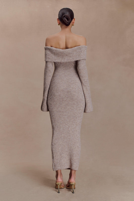 Baxter Off Shoulder Fluffy Knit Midi Dress - Taupe Marle