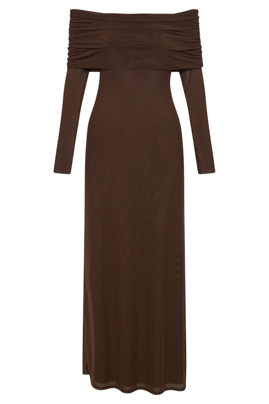 Josie Off Shoulder Mesh Maxi Dress - Dark Brown