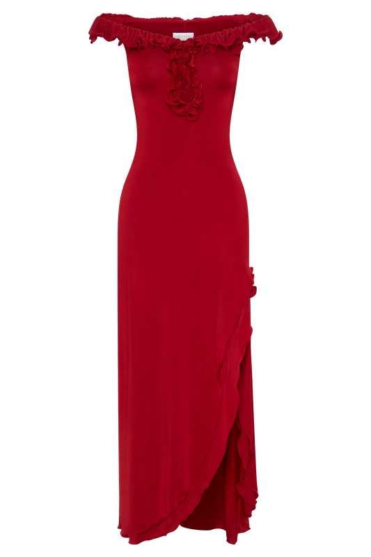 Allegra Off Shoulder Ruffle Midi Dress - Ruby