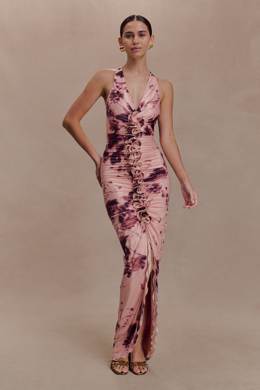 Alessandra Slinky Ruffle Maxi Dress - Pink Blurred Floral Print