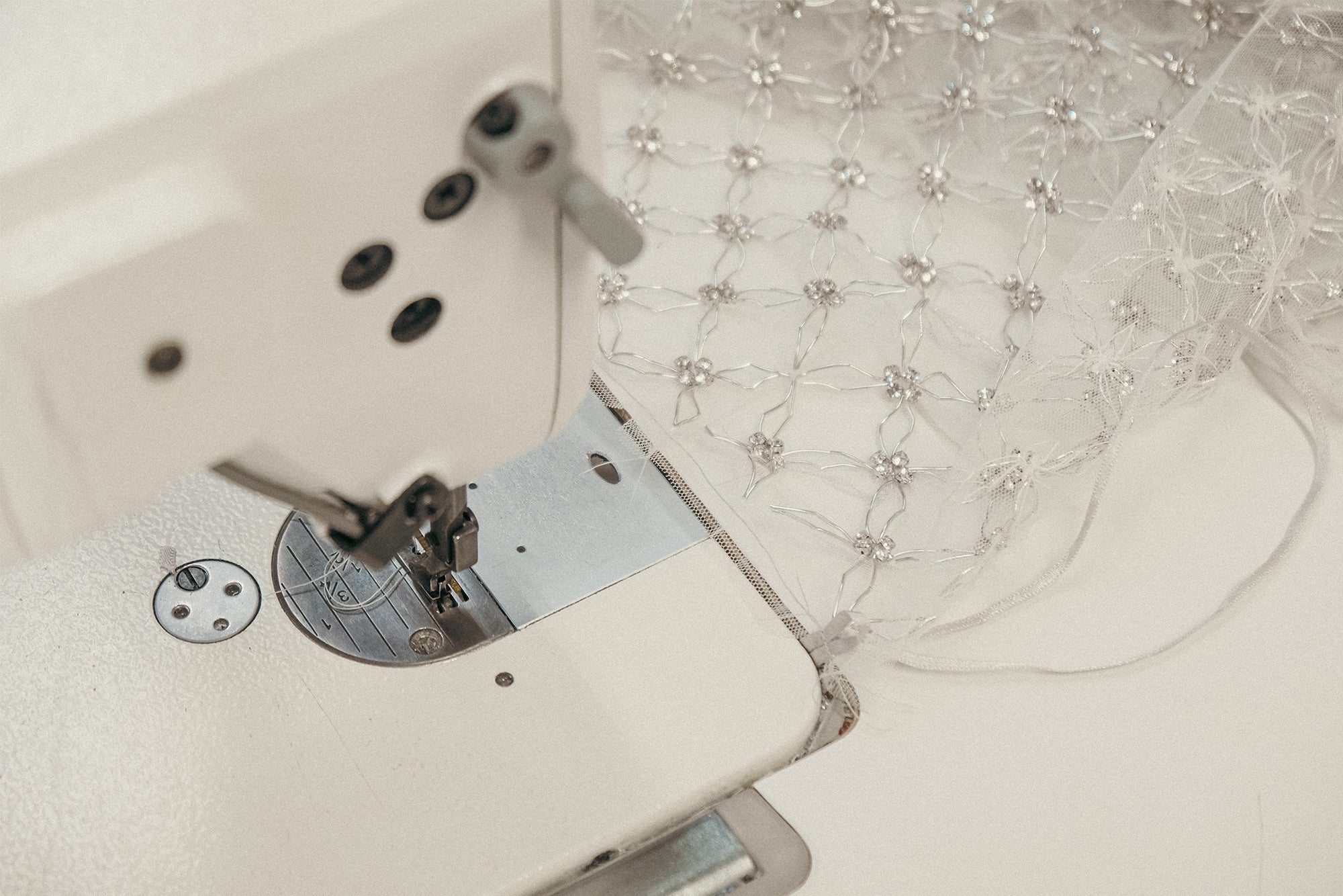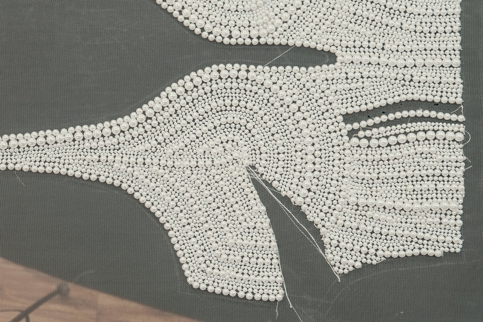 Our embellished styles are intricately hand-beaded with glass beads, a process that requires up to 200 hours to complete. A dedicated team of 15 work in harmony, with each bead meticulously threaded and sewn by hand, ensuring every detail is flawless.