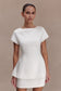 The ADELINE Short Sleeve Satin Top is a modern bridal piece designed for elegant transitions. Featuring a narrow boat neckline and softly structured short sleeves, it’s shaped with front princess seams that contour the bodice with precision. The longline A-line silhouette offers a flattering, elongating fit, while the back cut-out detail with pleats adds subtle drama and movement. Finished with a hook-and-eye closure at the top back neckline and button closure at the lower back, this top balances refined structure with considered detail — perfect for receptions, after-parties, or a polished second look.