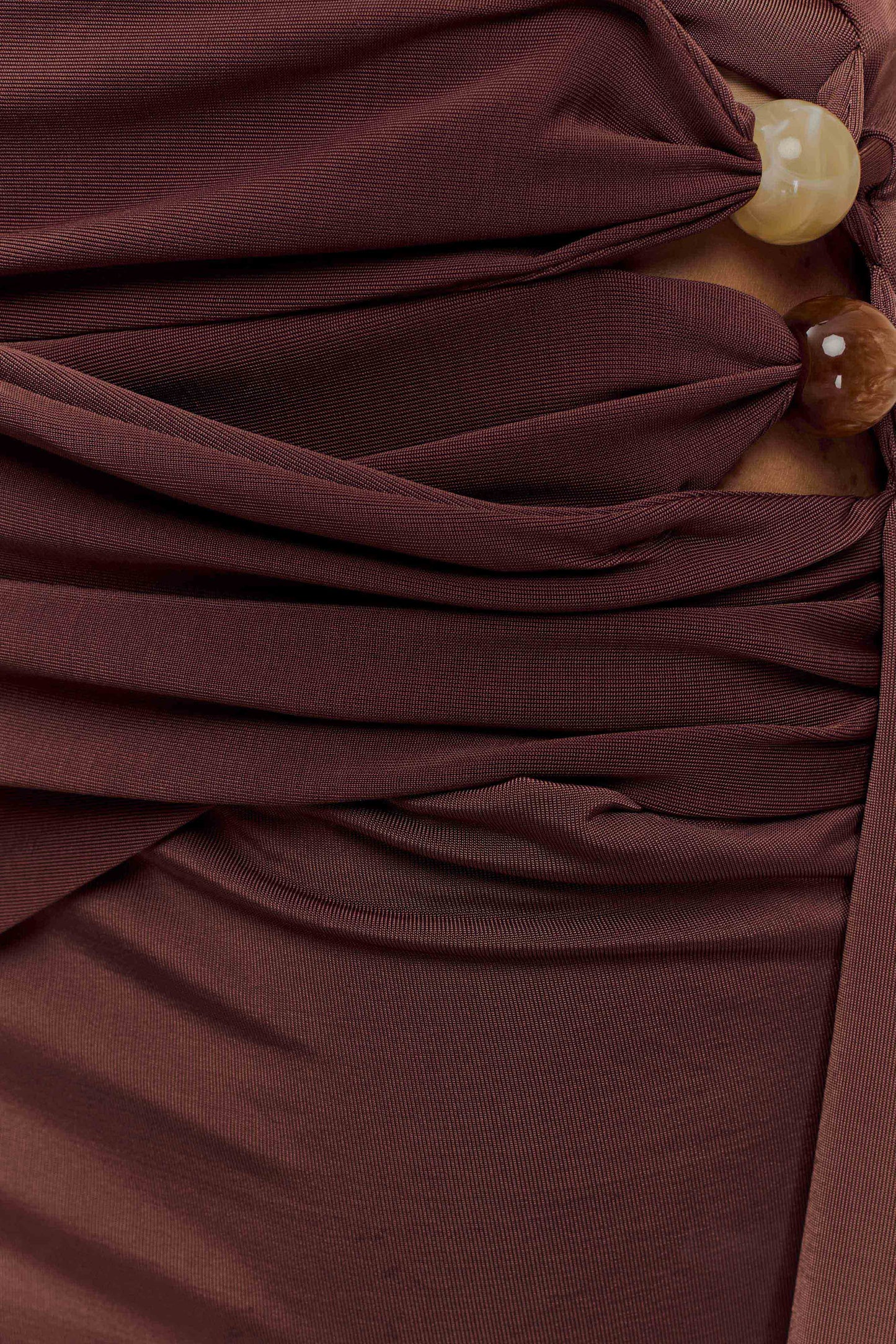 The ALICENT Slinky Beaded Mini Skirt is a statement piece designed to elevate your after-dark wardrobe. Featuring a mini length and shimmering beaded detail, this skirt is defined by its gathered wrap front and side overlay that contours the waist and adds fluid movement. Bold yet refined, this skirt shines from golden hour to the dance floor.