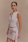 The ALICENT Slinky Beaded Top brings refined drama to elevated styling. Featuring a high neckline adorned with delicate beading, this sleeveless silhouette is balanced by a bold front cutout that frames the décolletage. The bodice is softly gathered to flatter the figure, creating a sleek, sculpted finish. Perfect for pairing with tailored trousers or a flowing skirt, this top adds shine and sophistication to any occasion—from sunset dinners to after-dark events.