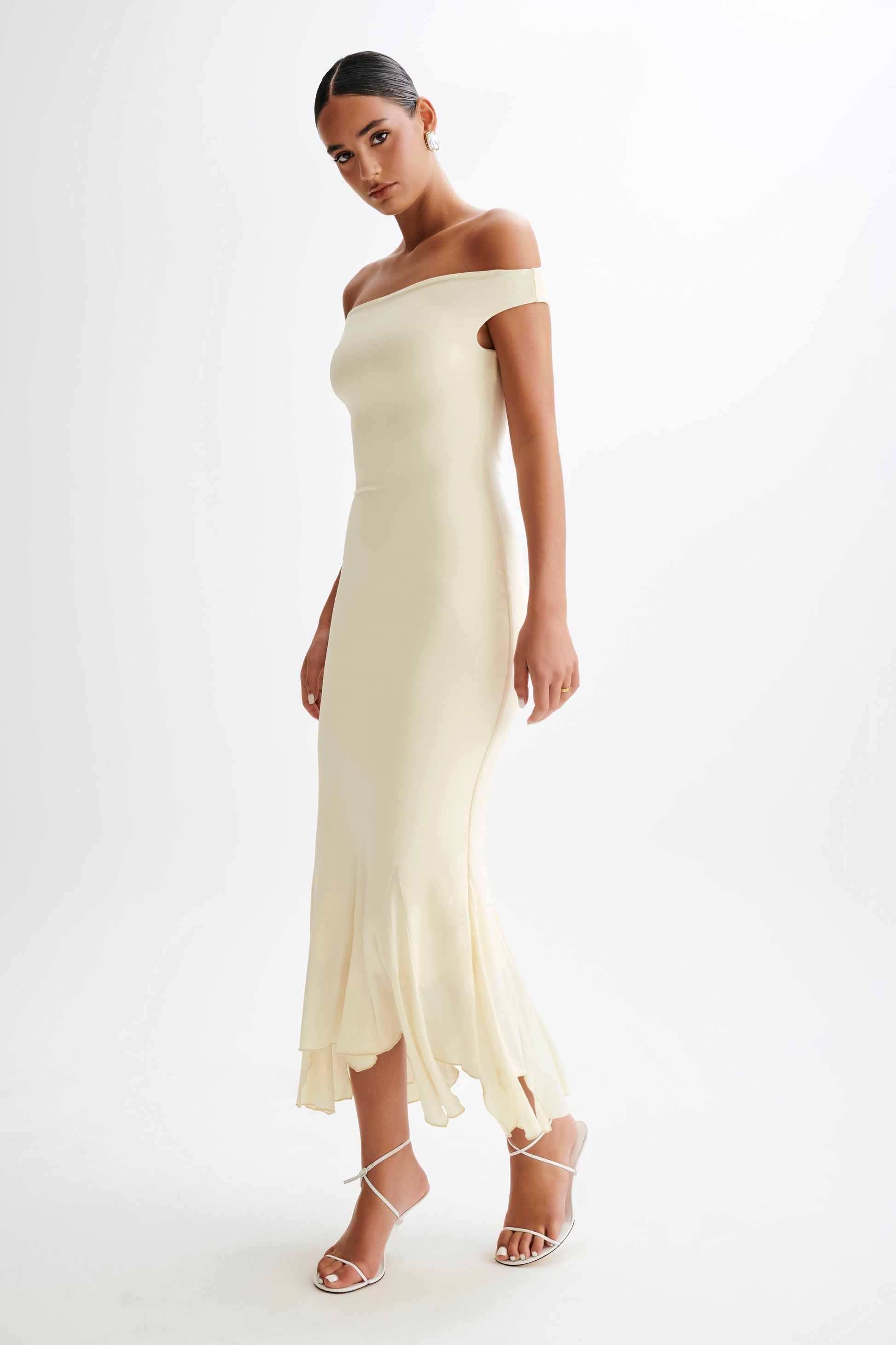 The ANALINA Slinky Handkerchief Midi Dress offers a sleek and stunning silhouette that perfectly marries classic charm with modern style. This elegant dress features a flattering Bardot neckline that highlights the shoulders and adds a touch of glamour. Designed with short sleeves and a bodycon fit, it contours gracefully to your shape, ensuring a sophisticated profile. The godet-lined hem introduces an unexpected flair, creating a dynamic and flowing movement as you walk. At a chic midi length and fully lined for premium comfort, the Analina Dress is a timeless piece for any occasion where style is a must.