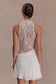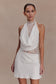The ARRA Chiffon And Lace Halter Mini Dress embodies delicate sophistication through its interplay of texture and form. Featuring a high neckline trimmed with an eyelash lace collar and a softly draped cowl front, it flatters with fluid movement and subtle allure. A lace back and waist cut-out add feminine contrast, balancing the airy chiffon with intricate detail. Fully lined for comfort and finished with a back keyhole button closure, this mini-length silhouette captures timeless elegance with a contemporary edge.
