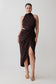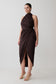 The AVELINE Draped Halter Midi Dress balances refined structure with fluid draping. A high halter neckline with soft cowl gathering frames the shoulders, fastening at the centre back with a self-covered button and loop closure. Subtle gathering at the waist seam enhances the silhouette, while a side cutout on the wearer’s right introduces a modern edge. The draped skirt falls into an elegant midi length, creating movement with every step. Fully lined for a smooth finish, this design delivers understated drama with effortless polish.