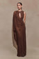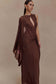 The BAKARI Diamante Cape Maxi Dress is crafted to command attention with its striking silhouette and refined detail. Designed with a crew neckline and gathered front, it flatters the frame with a fitted bodycon shape and front cut-out for added allure. The fixed overlay drape cascades from the shoulders like a cape, creating dramatic movement with every step. Finished with a back zipper closure and partial lining, this dress combines structure, shine, and sophistication for a show-stopping finish.