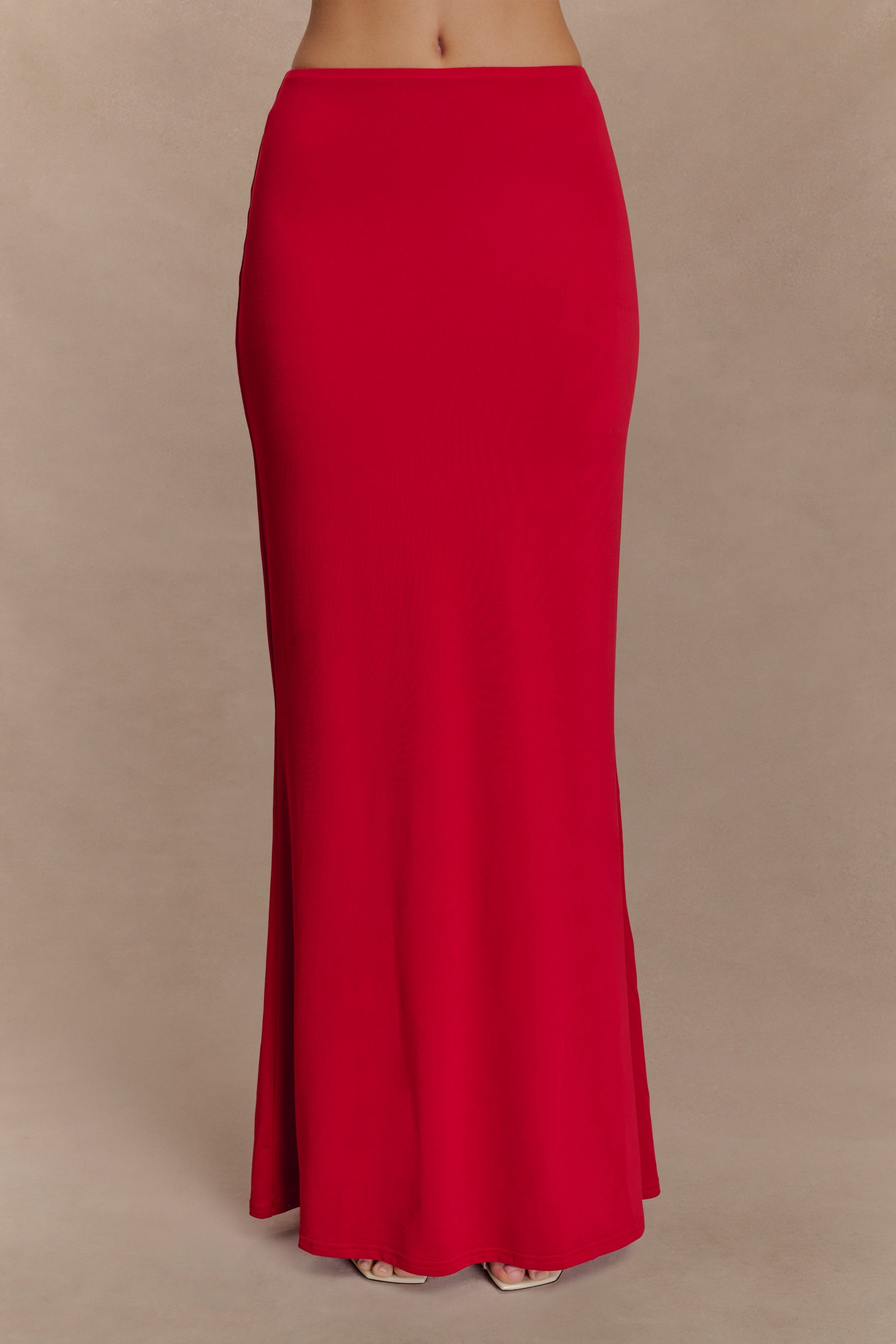 The BRUNA Slinky Fishtail Maxi Skirt is a captivating addition to any evening or formal wardrobe, designed to sculpt and highlight with its elegant and timeless design. This skirt features a mid-rise fit that comfortably sits at the waist, ensuring a flattering look. The iconic fishtail shape adds a dramatic flair, tapering down to a graceful flare at the hem, perfect for showcasing movement and enhancing every step. Its maxi length extends to the floor, creating a sleek, elongated silhouette. Fully lined for comfort and smoothness, this skirt is a sophisticated choice for special occasions that require a touch of glamour. Pair with the Mariposa Slinky Halter Top to complete the look.