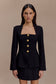 The CHRISTEL Suiting Fitted Blazer is a directional update to classic suiting. Designed with a straight neckline framed by bolero-style side panels, it redefines structure with a feminine edge. Princess seam lines sculpt the fitted silhouette, while internal shoulder pads and long sleeves sharpen the profile. A single-button cuff detail and button-front closure refine the look, all finished with a fully lined interior for polished comfort. Sleek and versatile, this blazer is cut to move effortlessly from desk to dinner.