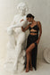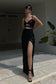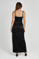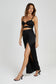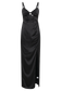 CLEO is a sexy, sleeveless, satin black dress with a sweetheart neckline and adjustable shoulder straps. The bust cups are slightly ruched and twisted in the centre with a mid-centre backline that closes via a standard hook and eye zipper. A twisted bodice panel sits right beneath the bust cups to create a sort of custom cut-out look while the maxi skirt has a front side slit and three pleats at the side seam to create a draped look. The shoulder straps are thin and braided at the front, adding to the dress’s visual texture.