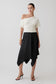 The CORALIE Asymmetric Satin Midi Skirt is designed to flow with effortless precision. Crafted in fluid satin, it drapes into a directional handkerchief hem that creates movement with every step. The midi length balances polish with ease, while a discreet side zip maintains a clean finish through the waist. Unlined for a lightweight feel, this silhouette delivers modern femininity with an edge of asymmetry.