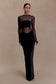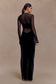 The DAVINA Velvet And Mesh Maxi Dress merges texture and form for a striking after-dark statement. Designed with a high neckline and long sleeves, it’s detailed with velvet and mesh cut-outs that trace the silhouette with precision. The bodycon fit sculpts the frame, while a back leg opening adds subtle movement. Partially lined for balance between coverage and allure, this dress embodies modern sensuality through sleek, structured design.