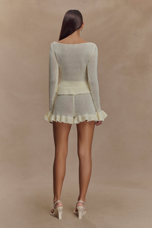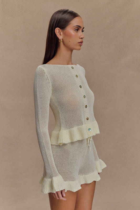 The ELEANOR Knit Frill Shorts are your new go-to for relaxed femininity. Designed with a high waisted fit, elastic waistband, and functional front tie, these shorts offer comfort without compromising on style. The playful ruffle hem adds a soft, romantic finish—perfect for lounging or low-key days out. Pair with the Eleanor Knit Frill Cardigan for a sweet matching set that feels as good as it looks.