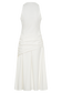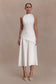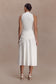 The EMILY Wrapped Waist Midi Dress is designed to balance tailored detail with soft femininity. Featuring a high neckline and a button-front opening set along an asymmetric seam, it offers a modern take on classic dressmaking. Princess seams through the bodice create a sculpted fit, while a gathered waist panel flows into a softly pleated skirt that moves with ease. Fully lined and cut to a flattering midi length, this dress is polished yet effortless — ideal for moments that call for quiet confidence and refined style.