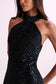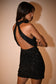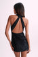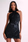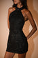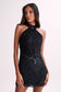 HATTIE is a sleeveless mini dress with a low, open back and halter neckline. The sleeveless cut transitions into a high neck fabric strap with a button at the centre back for ease of wear. Its soft MESHKI blend fabric is fully lined for comfort and adorned with a custom sequin design that glitters in the light. An invisible zipper closure ensures a smooth, seamless silhouette, emphasised with the dress’s bodycon fit. Pair with shoes like Geneva Square Diamante Mules for head-to-toe sparkle.