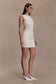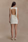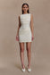 The HENLEY Slinky Drape Mini Dress is designed with refined movement and modern detail. Featuring a clean boat neckline, it opens into a low back secured with a delicate button closure. Draped overlays cascade across the bust and waist, flowing into a tie detail that falls elegantly from the right shoulder. Cut to a bodycon fit and mini length, this dress balances sculptural shaping with fluid lines for a sleek, statement finish.