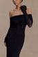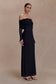 The JOSIE is a long-sleeved, off-shoulder maxi dress with a fold-over neckline and mesh skirt layer. Its stretchy bodycon fabrication makes for a classic, elegant silhouette that flatters curves. Fitted long sleeves and a cinched waist, paired with the slightly sheer fabric, create a visual that is at once both sensual and sophisticated. No closure gives it a beautiful, seamless finish.