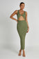 KAESHA is a knit sleeveless dress with wide straps, a deep V-neckline, and a large triangle cut-out around the lower torso. Its skirt is a maxi-length, bodycon fit that hugs the curves and falls to around the ankles in a straight hem. The custom MESHKI knit fabrication allows it to stretch and mold to your body without losing its original shape. The twisted centre knot adds another level of visual detail that makes this dress so attention-grabbing.