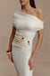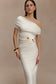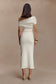 Own the spotlight in the KENDRA Scuba Jersey Midi Dress, a sculptural silhouette with elevated edge. Featuring an asymmetrical neckline and drop shoulder design, this dress is defined by its gathered shoulder and waist detailing that flatters the figure. Gold hardware accents add a luxe touch, while the fitted shape and midi length keep the look effortlessly refined. Unlined for a second-skin feel, this dress is your go-to for after-dark sophistication.