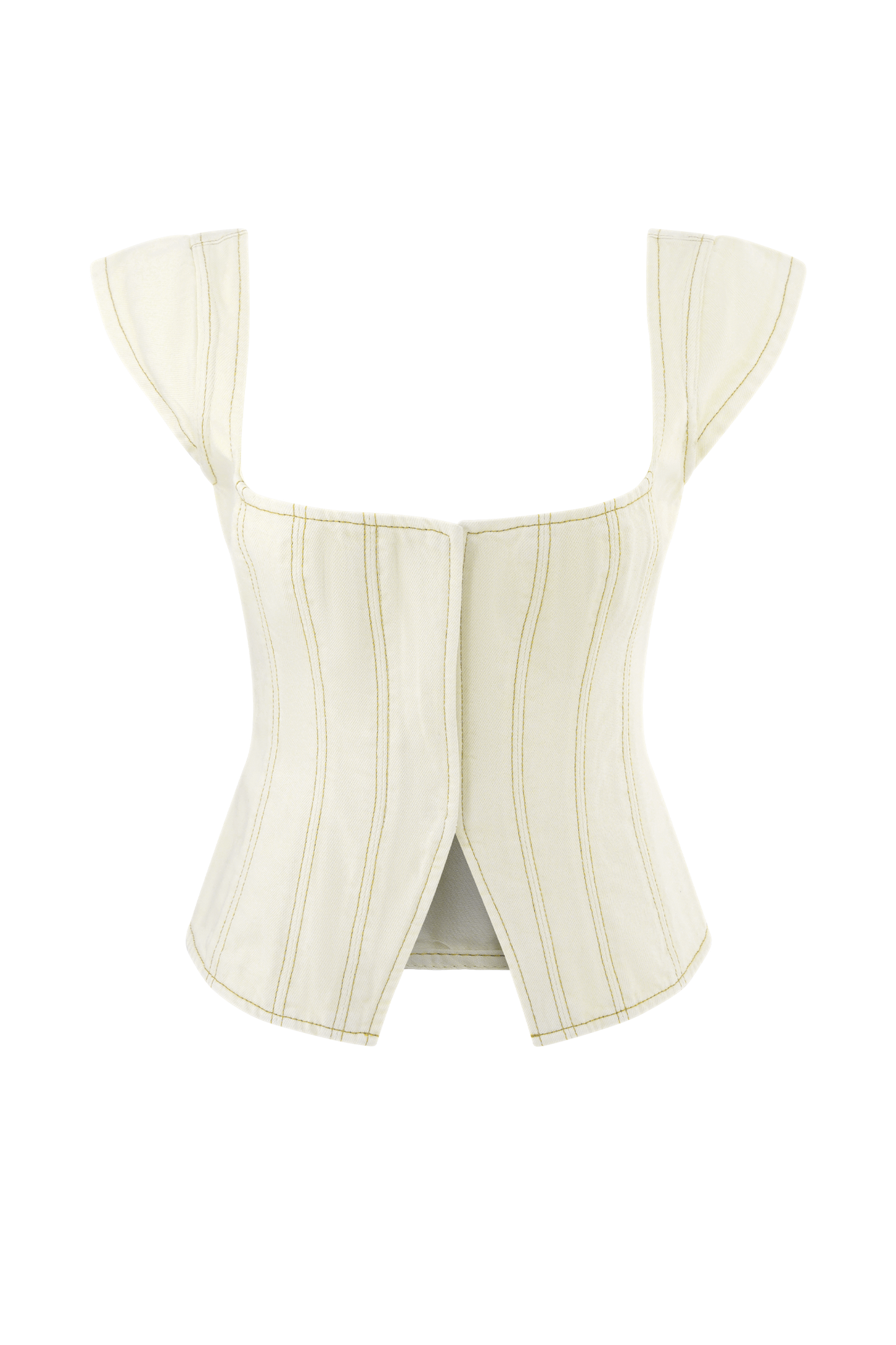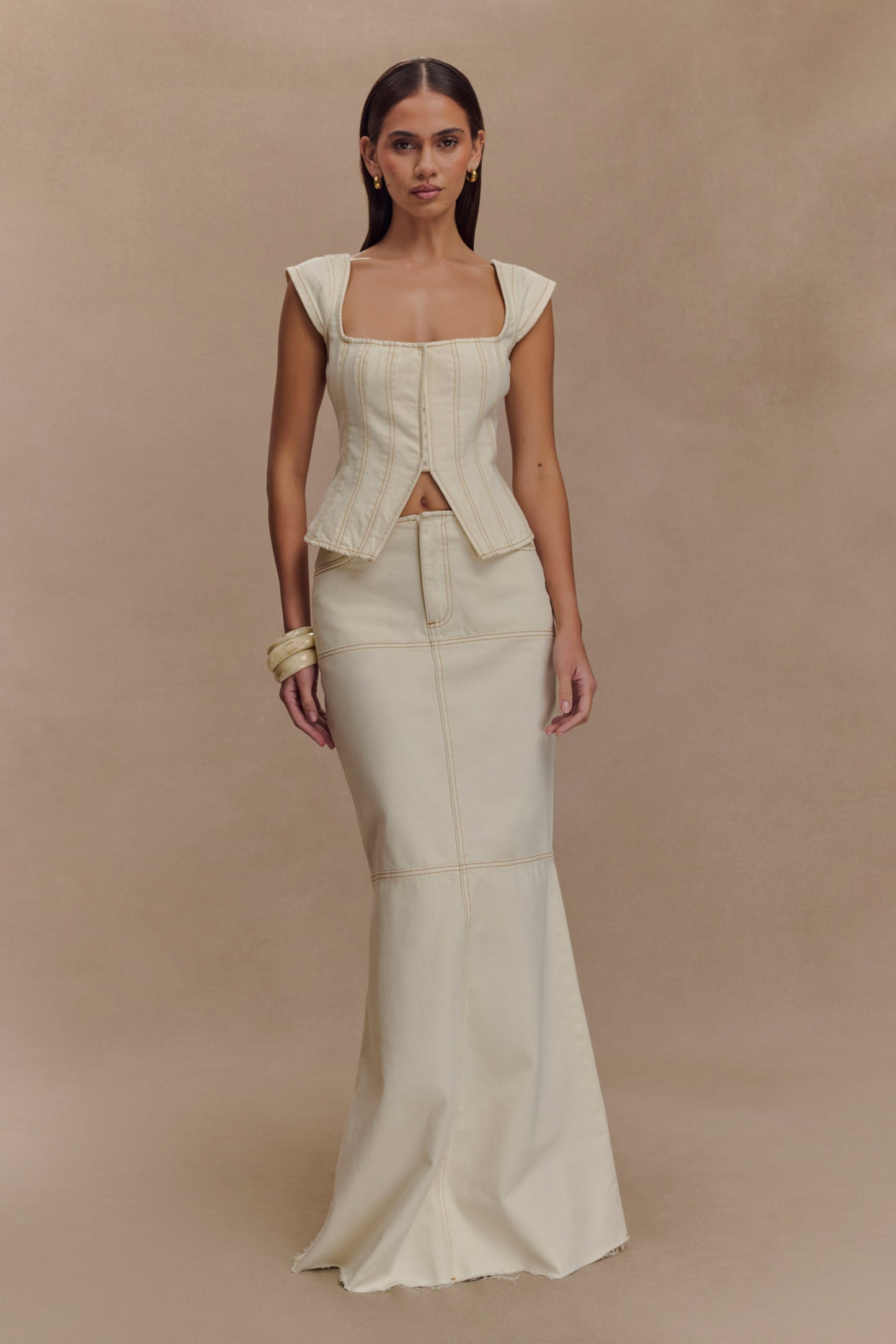 Sculpted and statement-making, the LORETTA Cap Sleeve Denim Top brings a fresh edge to everyday dressing. Featuring a structured square neckline and cap sleeves, this longline silhouette flatters with its flared hem and sculpted panel seams. A centre front opening with hook-and-eye closures adds a touch of vintage charm, while the structured denim fabrication holds its shape beautifully. Pair with the Loretta Denim Maxi Skirt for a coordinated look that redefines modern denim.