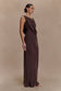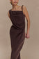 The LORIEANNE Draped Maxi Dress is a fluid take on evening elegance. Designed with an asymmetric neckline and a twisted single strap, this silhouette is elevated by artfully draped fabric that flows across the front and back. A subtle invisible zip maintains a clean, seamless finish, while the maxi length adds a sense of refined drama. Perfect for events where understated impact makes the loudest statement.