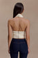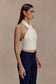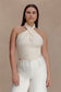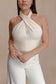 The MARION Cross Over Top is a modern statement piece with a sleek, cropped silhouette. Featuring a cross halter neckline that fastens with a back button closure, it frames the shoulders with bold simplicity. Fully lined for a smooth fit and finished with an exposed centre back zip, this top pairs effortlessly with tailored trousers or its coordinating bottoms for an elevated set moment.