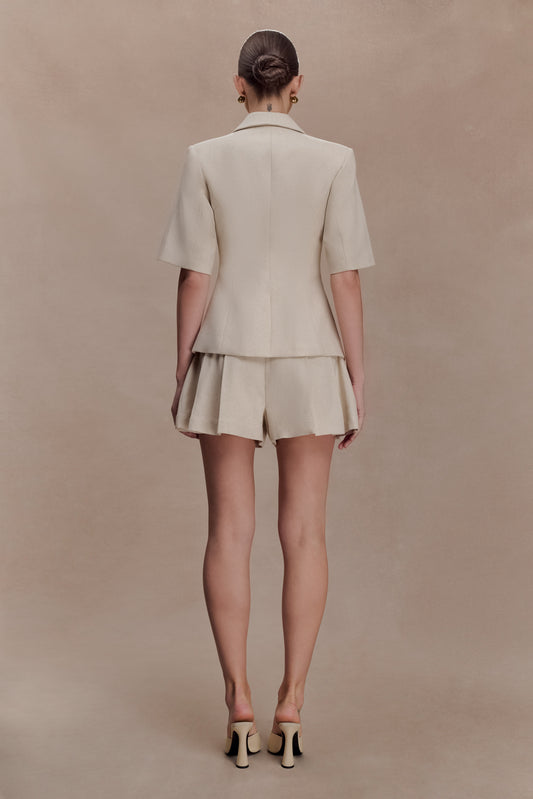 The MARTINE Pleated Linen Short offers a polished take on warm-weather dressing. Designed with a high-waisted fit and sharp front pleats, they create a structured yet effortless silhouette. Crafted in breathable linen and fully lined for comfort, these shorts maintain a clean finish with no pockets for a streamlined look. A classic front fly opening completes the tailored design, making these shorts an elevated essential for refined summer styling.