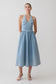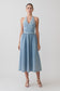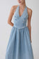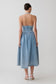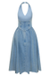 The MILLER Denim Halter Midi Dress brings tailored structure to a timeless fabrication. Designed with a halter neckline and flattering V front, it frames the upper body while sculpting through the fitted bodice. A gathered waistline enhances the silhouette before falling into a softly structured full skirt. Finished with a button and zip closure and cut to a refined midi length, this piece blends classic denim with modern femininity.