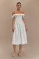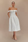 Step into timeless sophistication with the ORLA Strapless Cotton Midi Dress, a stunning piece that elevates any wardrobe.. This stunning piece showcases a sophisticated off-the-shoulder neckline that beautifully frames the shoulders. The fitted bodice features intricate boning panelling for added structure and support, creating a flattering silhouette. A rounded drop waistline transitions into a ruched full skirt, adding volume and movement. The gathered neckline frill adds a delicate touch, enhancing the overall charm of the dress. With its midi length and fully lined interior, this dress is perfect for special occasions or chic daytime outings, ensuring you look and feel your best.