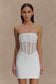 The PALMER Mesh Corset Mini Dress is designed to sculpt and accentuate. Featuring a strapless neckline and a mesh bodice, it’s detailed with a gathered bust overlay for soft texture. The boned waist shapes the silhouette, flowing into a fitted skirt that sits perfectly on the frame. Fully lined and finished with a sleek side zip, this dress blends modern structure with an alluring edge—made for moments where confidence is key.