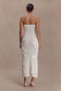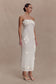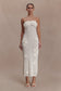 The SAMANTHA Crochet Midi Dress With Flowers is a sculptural statement in artisanal detail. Designed with a strapless neckline secured by internal grip tape for support, it contours the body in sheer crochet fabrication. Dimensional crochet florals add depth and movement, while draped pearl detailing introduces a refined contrast. Falling to a midi length and left unlined for a sheer, directional finish, this piece balances craftsmanship with contemporary confidence.