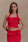 The SAMIRA Halter Knit Twist Top offers a romantic, modern take on knitwear. Designed with a halter neckline, it wraps into a fluid scarf detail that drapes elegantly around the neck. Wave-edged hem paneling and delicate floral accents create soft texture and visual interest, while the open back adds a sensual, airy finish. Crafted from a lightweight knit and left unlined for natural movement, this top brings effortless femininity to warm-weather outfitting.