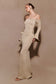 The SANDRINE Lurex Knit Maxi Dress is a striking blend of romance and refinement. Designed with a Bardot neckline and long sleeves, this fitted silhouette features flared sleeve hems and delicate ripple panel detailing through the front. The fishtail hem and softly rippled finish create graceful movement, while the unlined knit fabrication hugs the body in all the right places. this dress is your go-to for elevated evenings, balancing softness with sculptural allure.