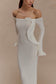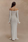 The SANDRINE Off Shoulder Knit Maxi Dress is a striking blend of romance and refinement. Designed with a Bardot neckline and long sleeves, this fitted silhouette features flared sleeve hems and delicate ripple panel detailing through the front. The fishtail hem and softly rippled finish create graceful movement, while the unlined knit fabrication hugs the body in all the right places. this dress is your go-to for elevated evenings, balancing softness with sculptural allure.
