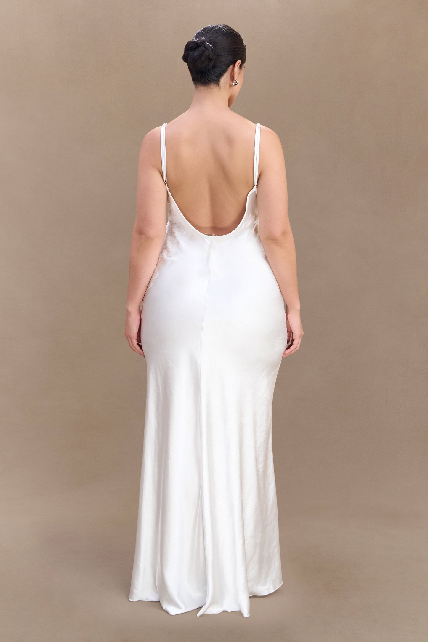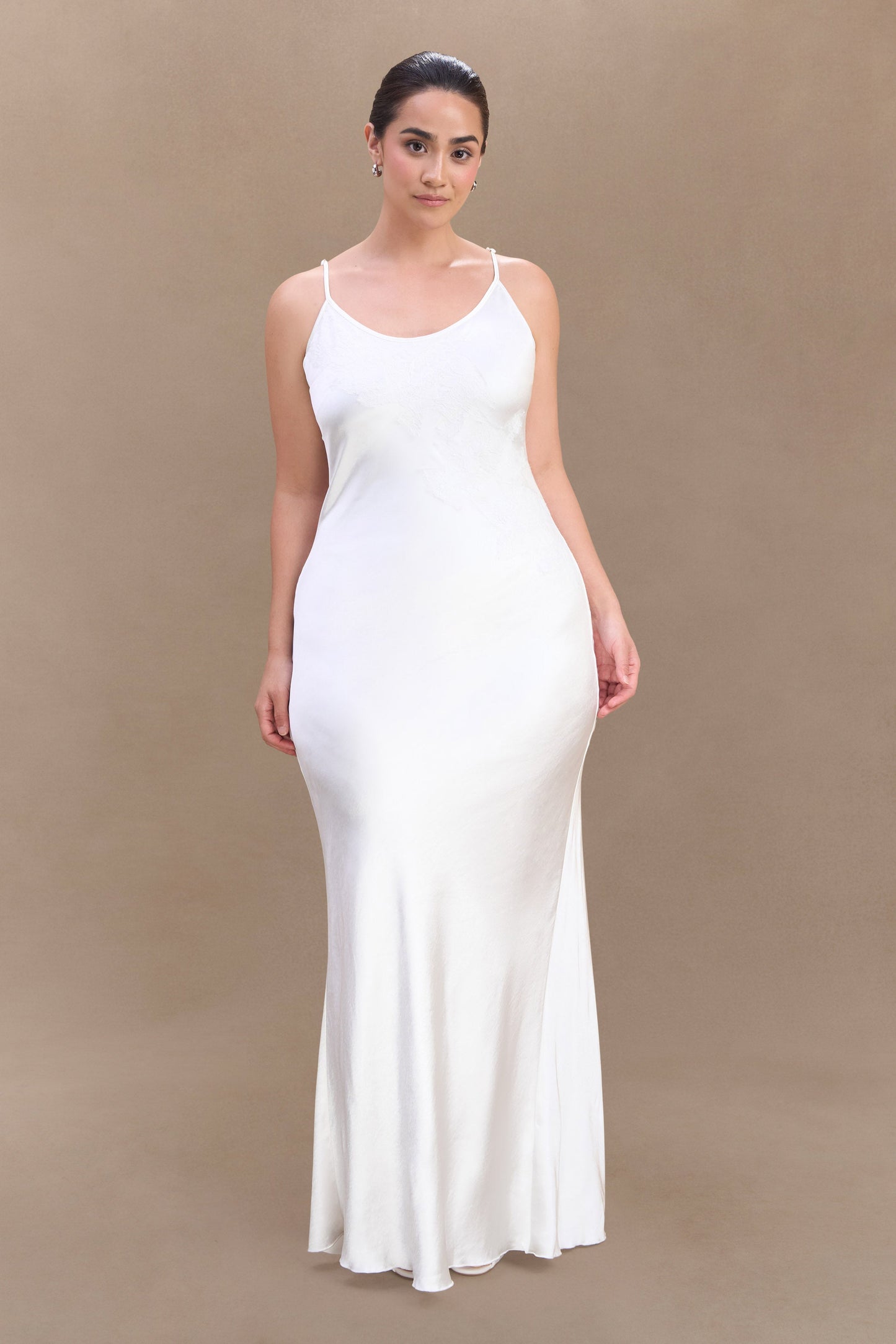 The SAYLOR Satin Slip Maxi Dress is a vision of understated elegance. Designed with a soft scoop neckline and a sultry low back, this dress drapes beautifully over the body for a sleek, feminine silhouette. Delicate lace detailing adds a touch of romance, while the bound neckline and adjustable straps ensure a perfect fit. Falling to a fluid maxi length and left unlined for a lightweight, natural feel, this dress is perfect for intimate evenings, special occasions, or effortlessly chic bridal moments.