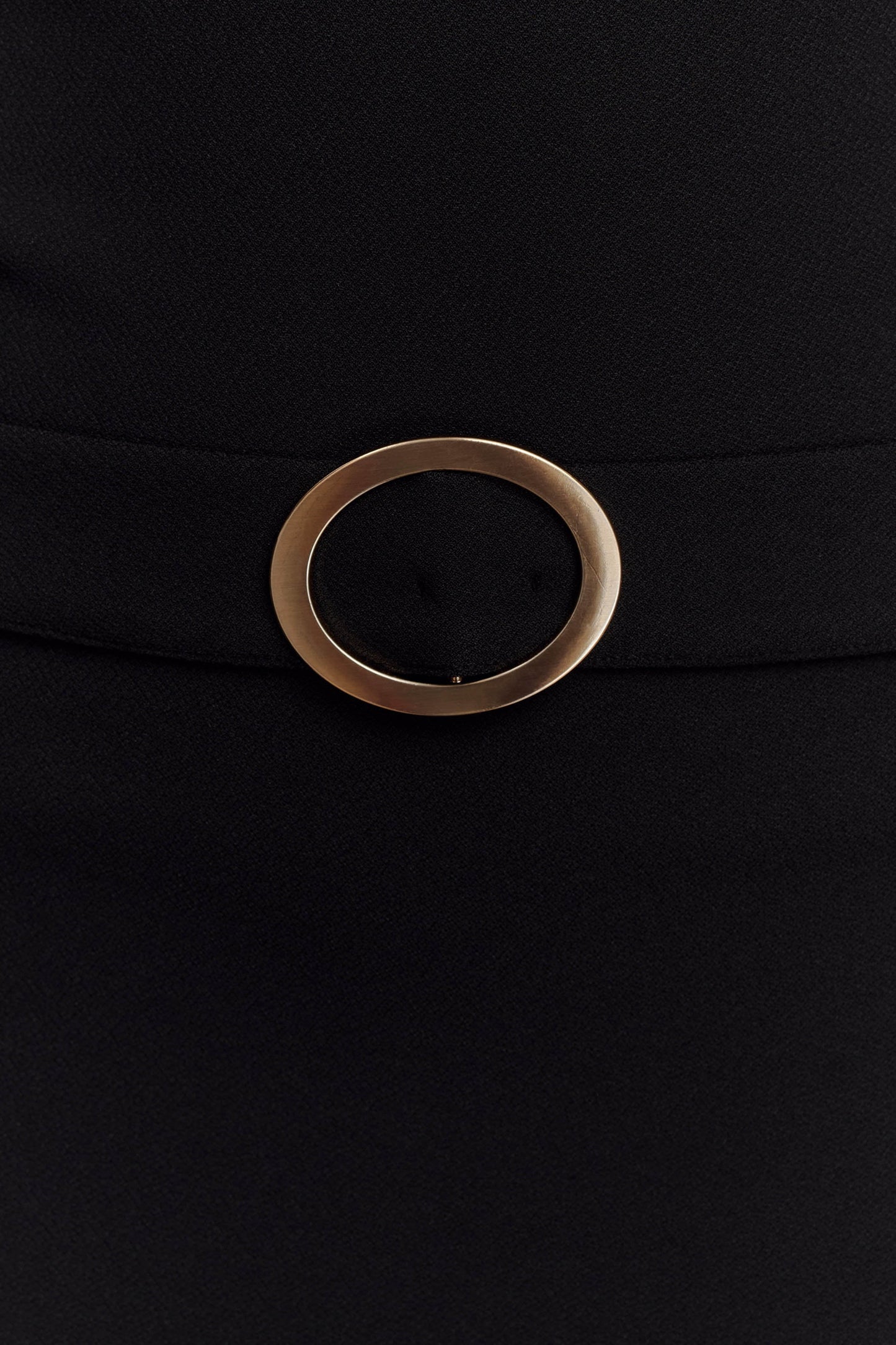 Make a sleek statement in the SCHEANA Stretch Crepe Mini Dress, where clean lines meet powerful design. Featuring a high neckline and wide shoulders, this sleeveless silhouette creates a confident frame. The mini length is balanced by a low-rise waist belt that accentuates the figure, while the stretch crepe fabric hugs in all the right places. Fully lined for comfort and structure, this dress is your go-to for elevated nights out with a modern edge.