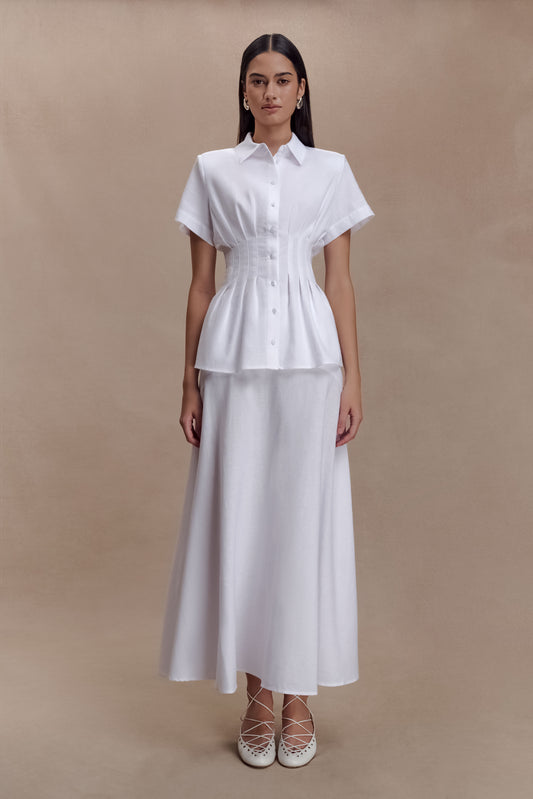 The SELMA Short Sleeve Linen Shirt offers a crisp yet relaxed take on warm-weather tailoring. Designed with a classic collar and short sleeves, it features subtle front and back bodice tucks that add shape while maintaining an effortless drape. The button-front opening keeps the silhouette clean and versatile, while the unlined linen fabrication ensures breathability and comfort. Polished yet unfussy, this shirt is made to elevate everyday dressing — perfectly paired with the matching Selma skirt or styled back with tailored staples.