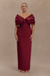 The THELMA Bardot Maxi Dress offers two equally striking ways to wear—gathered sleeves resting delicately on the shoulders for a refined finish, or draped off the shoulders for an alluring Bardot silhouette. Designed with a flattering V-neckline, pleating across the body, and a relaxed pencil-shaped fit, this dress flows to a maxi length for an elongating effect. Internal bust cups, a secure waist stay, and an invisible centre back zip ensure a supportive fit, while internal snaps and a chain loop make its multi-way styling effortless. Fully lined for comfort, this dress is a sophisticated choice for both classic and contemporary moments.