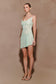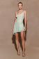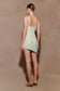 The ZAHRA Diamante Cowl Mini Dress brings luminous elegance to a sculpted silhouette. Designed with a softly draped cowl neckline, it frames the décolletage with fluid ease, while diamante detailing adds a subtle, light-catching finish. The fitted bodycon shape contours the figure, balanced by a low back and a sleek strap detail for a confident reveal. Finished with an asymmetric hemline that adds movement and modern edge, this fully lined mini-length dress is made for nights that call for effortless glamour.