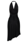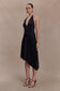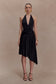 The ZELDA Asymmetric Slinky Midi Dress is designed to contour the body with modern elegance. Featuring a plunging V halter neckline with an adjustable neck tie, it frames the décolletage with confident allure. A front knot detail and gathered waist sculpt the silhouette, enhancing shape while maintaining fluid movement. Finished with an asymmetric hankie-style skirt, this fitted bodycon design falls to a midi length with effortless drape — refined, directional, and made for elevated evenings.